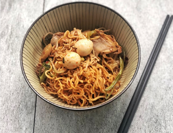 Теперь обжарьте на растительном масле куриное бедро (до полной готовности). Параллельно отварите лапшу в течение двух минут и обжарьте яйца в стиле скрэмбл. Добавьте нарезанный красный лук и обжаривайте его 30 секунд.